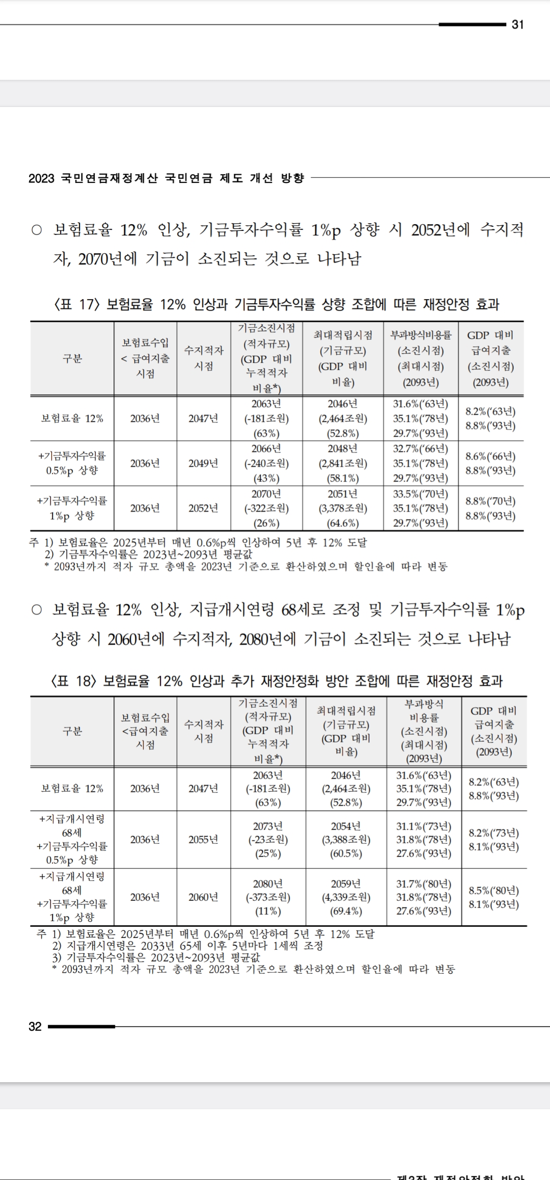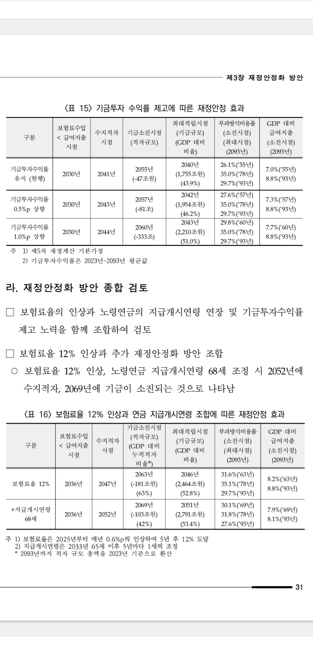 2023년 5차 국민연금재정계산위원회 최종보고서에 따르면 기금투자수익률을 높이는 것이 국민연금의 지속 가능성에는 큰 효과가 없음을 알 수 있게 하고 있습니다. 자체적으로 통제가 불가능한 기금 수익률 제고 논의보다는, 국민연금의 수지균형, 즉 내는 돈과 받을 돈의 균형을 맞추려는 노력이, 왜? 그리도 절박한 것인 지를 적나라하게 보여주고 있습니다!!