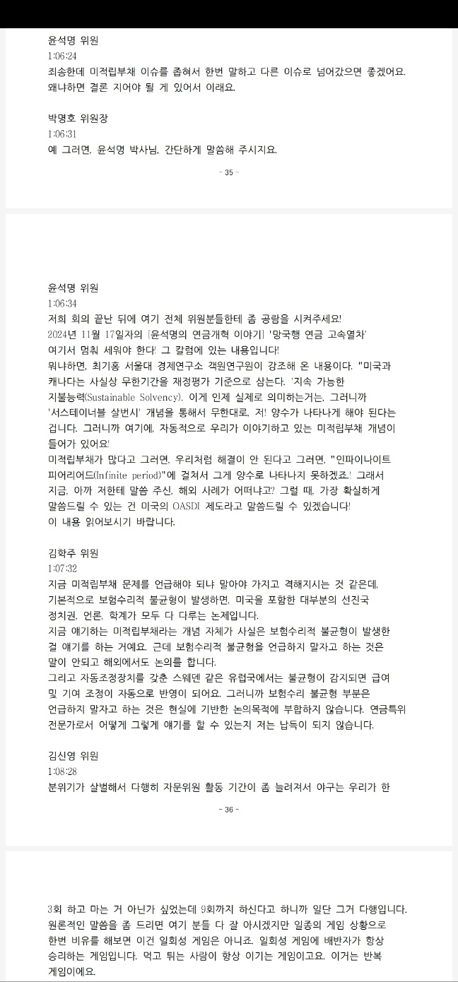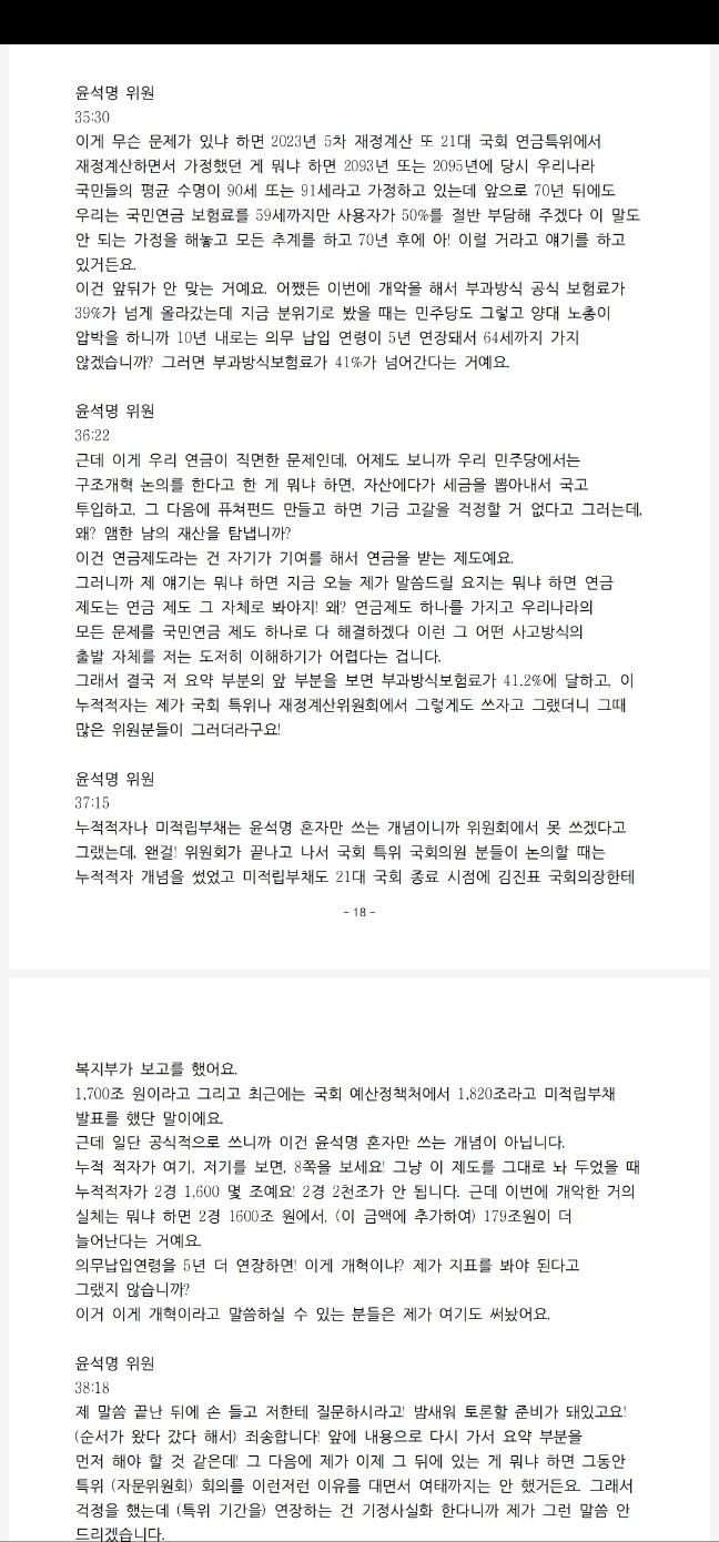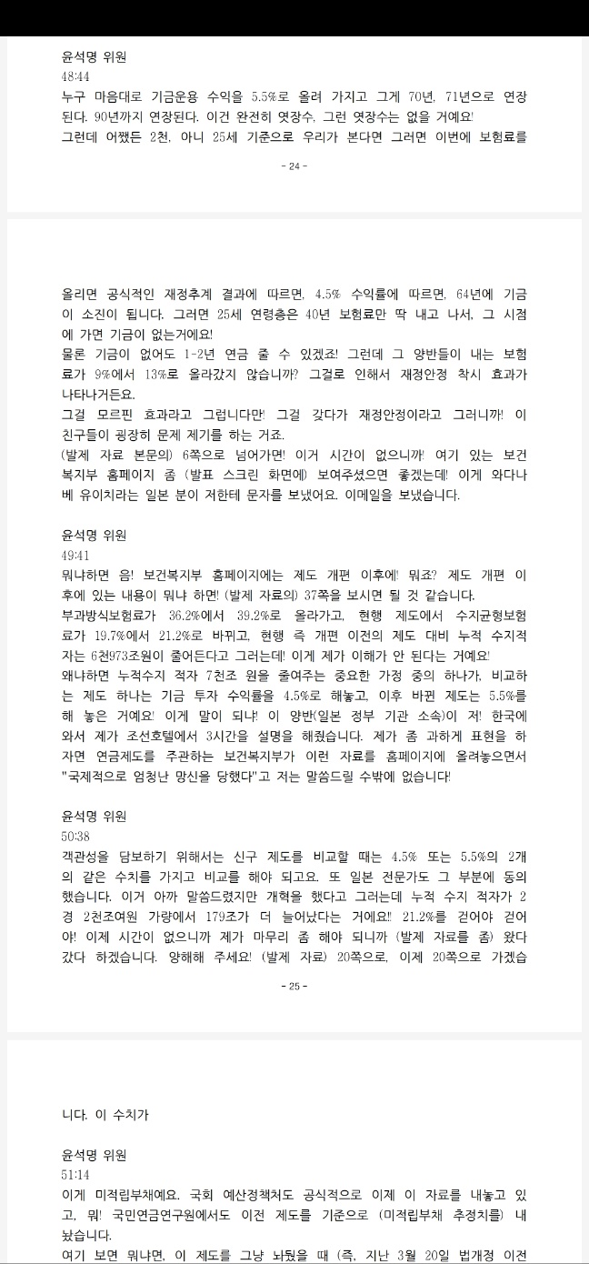 저의 그런 내용이 1쪽에 있습니다. 이 경우 역시 대국민 사기극을 벌였다는 거예요. 뭐냐면 이걸 제가 NATV(국회방송) 정관용의 정책토론 생방송에서 지적을 했을 때도, 또 사실이 아니라고 그랬던 분이 국회 연금특위의 21대 국회 여당 간사였던 유경준 의원이 지적이 했을 때는 그 자료가 중요한 것 같지 않아서!