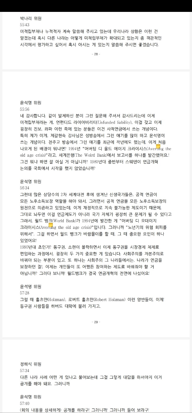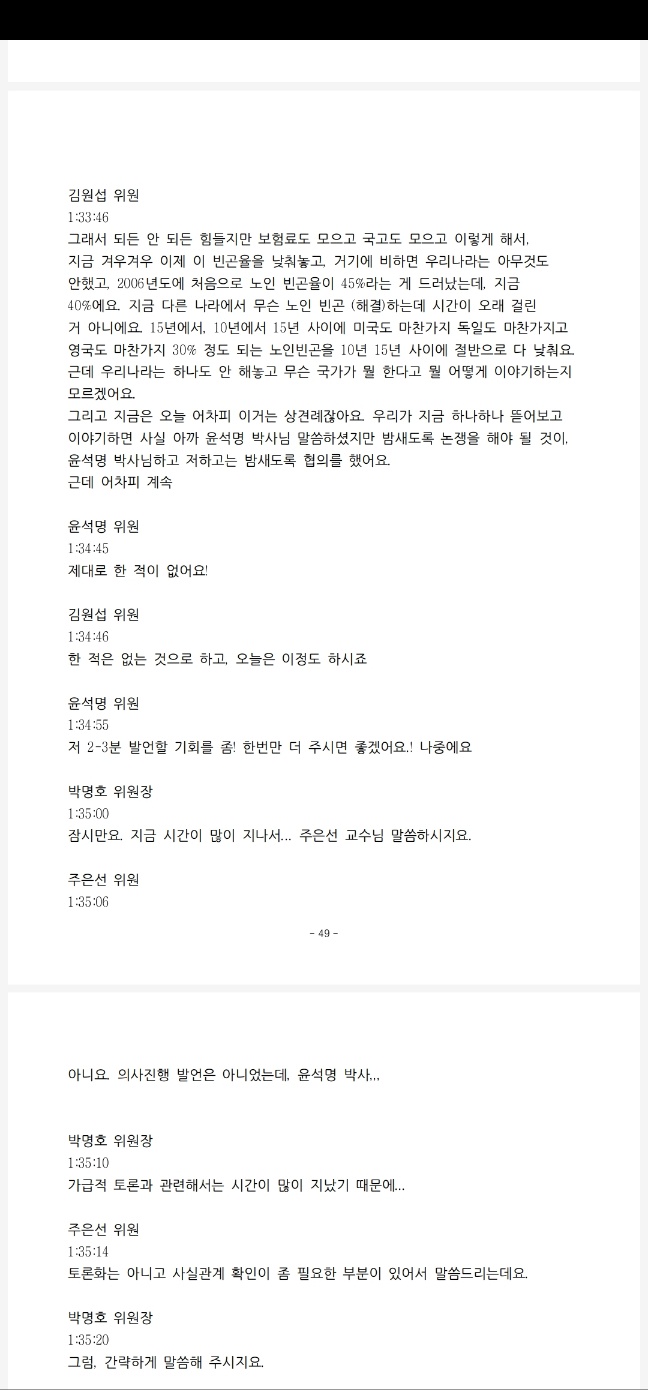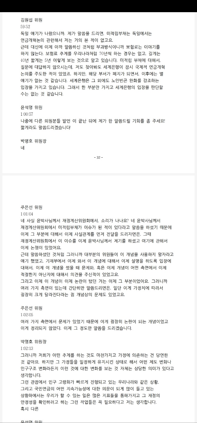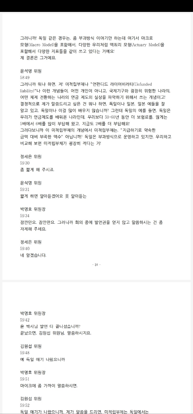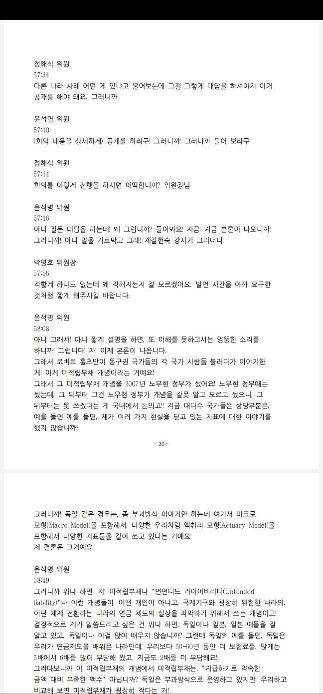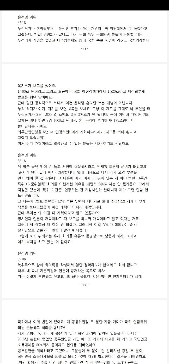녹취록으로 상세 회의록을 작성해서 일단 정확하지가 않더라도 회의 끝나고 하루 내 즉시 자문위원과 언론에 공개하는 쪽으로 하자. 저는 이렇게 추진하고 싶고요. 또 하나 중요한 것은 뭐냐면 언제부터인가 21대 국회에서 이게 변질이 됐어요. 왜 공동위원장 두 분만 가끔 가다가 국회 연금특위 의원 분들하고 회의를 합니까?