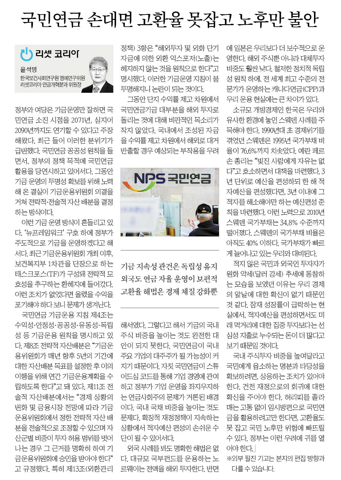 국내 주식투자 비중을 높여달라고 국민에게 읍소하는 명분과 타당성을 확보하려면, 상응하는 조치가 있어야 한다. 건전 재정으로의 회귀에 대한 확신을 주어야 한다. 허리띠를 졸라매는 고통 없이 임시방편으로 국민연금을 활용하려고만 한다면, 고환율도 못 잡고 국민 노후만 위험에 빠뜨릴 수 있다. 정부는 이런 우려에 귀를 열어야 한다.