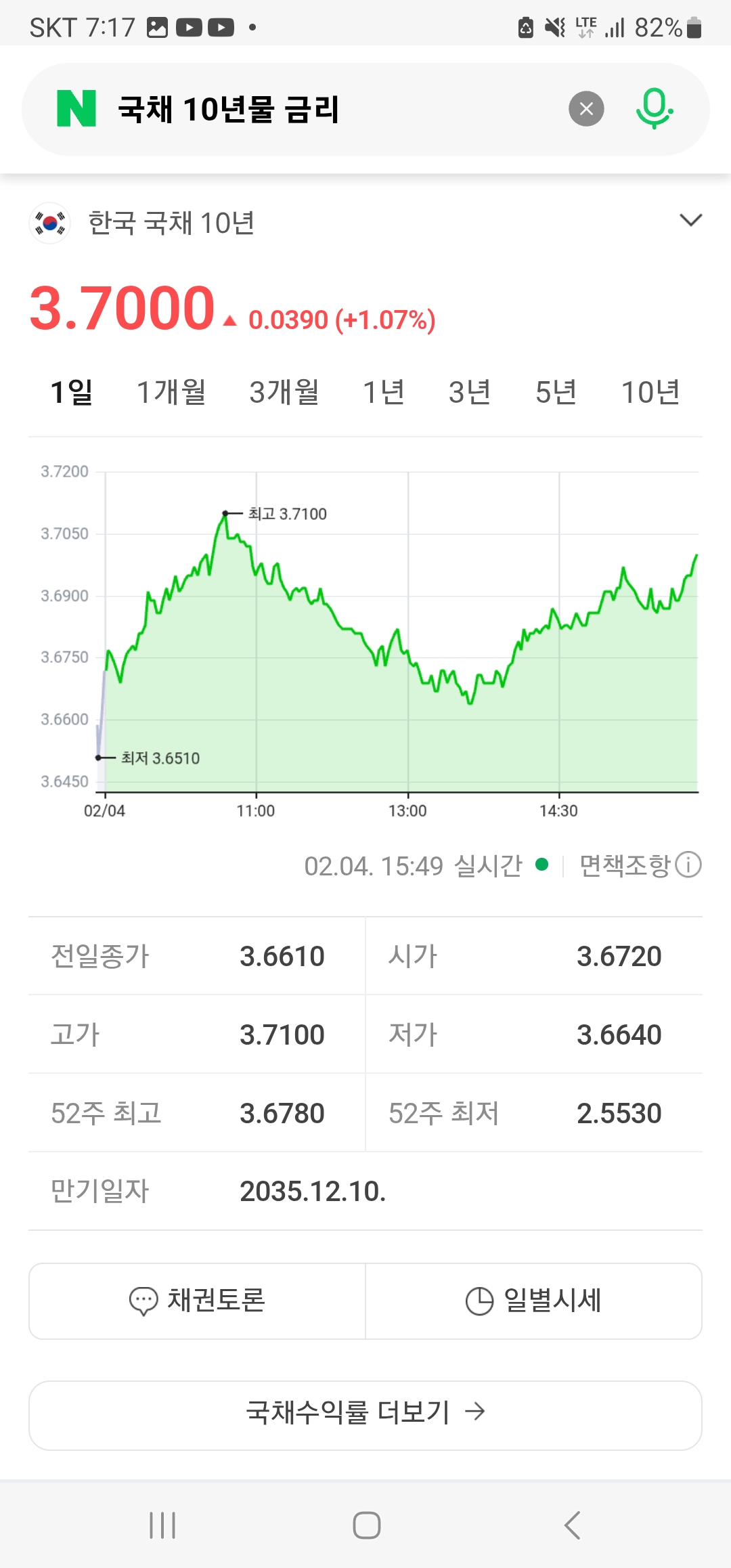 장미빛 주식시장과는 달리 국채시장 상황은 좋아보이지 않는다. 기준금리가 2.5인 상황에서 어제(2월 4일) 국채 10년물 금리는 52주 최고인 3.71을 기록한 뒤, 3.7로 마감했다.